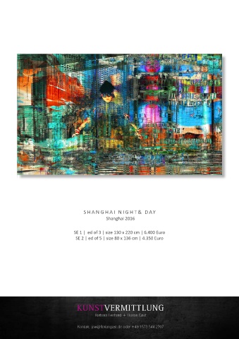 SHANGHAI NIGHT & D AY Shanghai 2016 SE 1 | ed of 3 | size 130 x 220 cm | 6.400 Euro SE 2 | ed of 5 | size 80 x 136 cm | 4.350 Euro KUNSTVERMITTLUNG Barbara Lenhard + Florian Gast Kontakt: jcw@floriangast.de oder +49 1573 544 2707