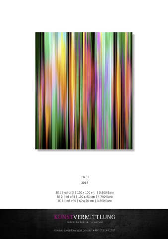 PA LI 2014 SE 1 | ed of 3 | 120 x 100 cm | 5.600 Euro SE 2 | ed of 5 | 100 x 83 cm | 4.700 Euro SE 3 | ed of 5 | 60 x 50 cm | 3.800 Euro KUNSTVERMITTLUNG Barbara Lenhard + Florian Gast Kontakt: jcw@floriangast.de oder +49 1573 544 2707