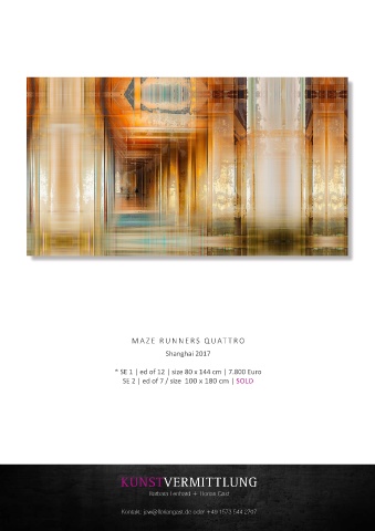 MAZE RUNNER S QUAT TR O Shanghai 2017 * SE 1 | ed of 12 | size 80 x 144 cm | 7.800 Euro SE 2 | ed of 7 / size 100 x 180 cm | SOLD KUNSTVERMITTLUNG Barbara Lenhard + Florian Gast Kontakt: jcw@floriangast.de oder +49 1573 544 2707