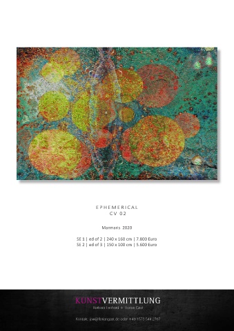 EPHEMERICA L C V 02 Marmaris 2020 SE 1 | ed of 2 | 240 x 160 cm | 7.800 Euro SE 2 | ed of 3 | 150 x 100 cm | 5.600 Euro KUNSTVERMITTLUNG Barbara Lenhard + Florian Gast Kontakt: jcw@floriangast.de oder +49 1573 544 2707